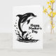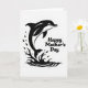 This card features a black silhouette of a smiling marine animal leaping up from a curling splash of water on a bright white background. The animal sits on the left side, its arched body and tail angled upward as if it’s springing toward someone just out of view, adding a gentle, affectionate energy ❤️. Around it, the water is drawn as swirling waves and scattered droplets, giving the scene lively motion without adding extra colors. On the right side, the words “Happy Mother’s Day” are set in thick, rounded black lettering, stacked neatly to balance the artwork. The friendly eye inside the dark shape creates a warm, companionable look, like a small nod shared between friends or family. The wide open white space between the animal and the message keeps everything easy to read and lets the image breathe 🌼. The splash curls in a loose spiral at the base, with a few ink-like specks flicking outward near the animal’s belly and tail.