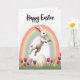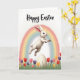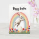 Designed with a soft spring scene, the front shows a white rabbit with gentle shading leaping through the air, its dark eyes and rosy cheeks turned as if sharing a sweet, friendly glance with the viewer 🐰. Beneath it sits a large ivory egg with smooth highlights, grounding the action at the center. A wide rainbow arches in the background in muted bands of red, orange, yellow, green, and blue, giving the sky a calm, dreamy look. Along the lower third, green grass spreads across the bottom edge, dotted with upright tulip-like flowers in red, pink, purple, and yellow 🌷. Near the top, a short greeting appears in thin, flowing lettering, centered and set in a dark tone that stands out against the pale sky. The lighting stays soft and even, making the rabbit’s fur look velvety and the egg’s surface gently glossy. Small blades of grass and clustered blossoms form a colorful border along the bottom, with the rainbow fading lightly behind them.