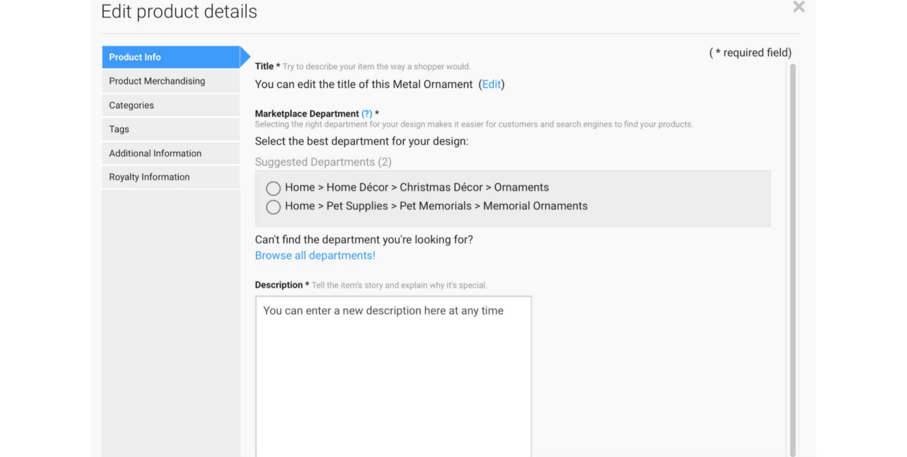 The design description section is your chance to connect with customers on a more personal level. You’ve worked hard on your designs, and your customers should know it! This is your opportunity to tell your creative story.