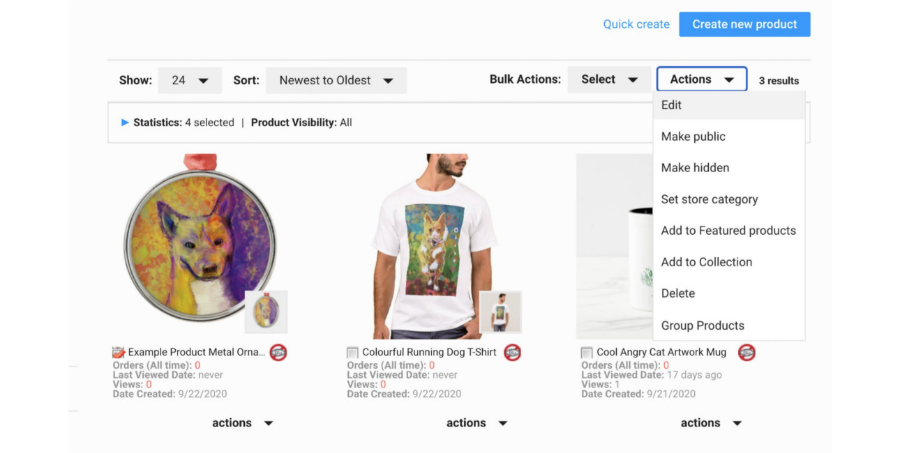 Within your Products tab (located within your store’s dashboard), you will be able to track how well each of your products are doing by using several different metrics. Click on the Actions drop-down and click Edit to update your metadata, royalty percentage, and even your product visibility. Editing your metadata is a great way to keep up with new trends without creating new products so don’t forget to give it a refresh from time to time.