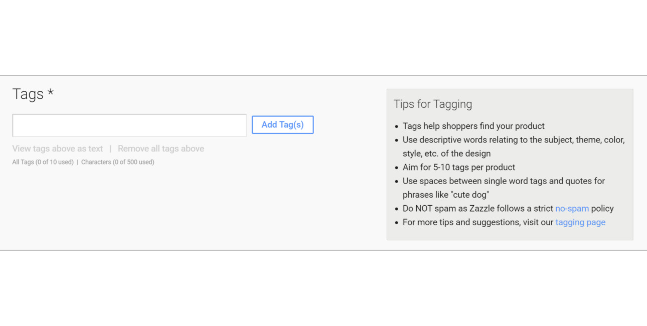 Both your product’s titles and tags are the ‘keywords’ that you use to describe your product. Zazzle uses these keywords to catalog your products, and relies heavily on them when delivering a customer’s search results. This is ultimately how your customers will discover your products, both on Zazzle and Google, so take your time when thinking this out.