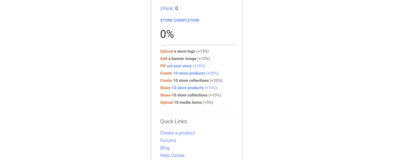 Your zRank is an ongoing, qualitative score between 1 and 10, which allows you to see, at a glance, how well your store and its products are optimized for the marketplace. The closer your zRank gets to 10, the stronger the influence your store has within search results. It’s also a great way to gauge how appealing your store is to its visitors, so be sure to spend some time building out your space. You can find your zRank score on the Home tab of your store:
