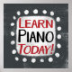 "Learn Piano Today" is a cute text design in gray with black and red text. It sits on a white accent shape and cute white polka dots surrounding it.