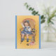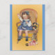 Vintage artwork of a little girl sitting in a big rocking chair with her dolls, learning to sew by making doll clothes