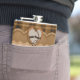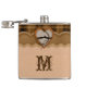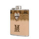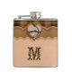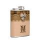 Western cowgirl themed drinking flask done in graphics of a tan leather look, with a brown decorative band, around the top, with a heart, on the middle of the front. Personalize the brown one letter monogram for yourself or as a great gift idea.