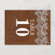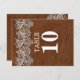 © 2013 Socialite Designs. Our unique table number card has a leather- and lace-look design, perfect for any country or rustic party or event. A classy combination of masculine and feminine design elements for a romantic event. PLEASE NOTE THAT THE LACE AND LEATHER ARE IMAGES THAT ARE PRINTED ON TO THE INVITATION AND ARE NOT REAL. If you require HELP with customizing or need additional wedding products with this design, please contact Socialite Designs.