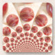 The artwork showcases a central cluster of red cricket balls that radiates outwards in a concentric, spiraling fashion. The balls vary in size, suggesting depth and perspective. The background is a soft, textured off-white, providing a subtle contrast that highlights the rich red of the cricket balls. The overall effect is visually engaging and creates a sense of organized yet dynamic movement.