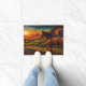 A detailed leather doormat depicting a horse with a saddle and a headdress standing in a field at sunset.