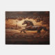 Dark brown leather doormat with embossed horse design in countryside scene with barn, hills, trees, and decorative border. Detailed and intricate