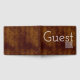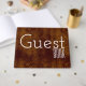 A faux aged brown leather background has a stylish bold white font with the words "guest book" and a template for the date of your event or function.