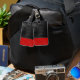 Red and black colored stitched leather close up with seam