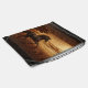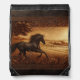 A black horse runs through golden grass at sunset, {LOOKS LIKE IT} intricately carved into leather, capturing nature's beauty & artisan craft
