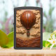 This lighter features a central hot air balloon drifting over textured, wavy terrain or clouds rendered in deep relief. The background is filled with puffy, stylized clouds matching the tone of the landscape below. The entire scene is framed by an ornate border at the top and bottom corners. The monochromatic brown and tan palette emphasizes the deep dimensional relief and the leather-worked or embossed surface texture. The artwork is set on a matte black lighter casing. The design may look real due to the high detail in the artwork.