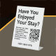 Ask customers to leave a review. Sign says: "We hope you have had a pleasant experience staying with us. If so, please take a few moments to leave a review". Change wording to suit your requirements. Change the QR Code link to the link leading to your own reviews page. If Google, advice is given here: https://tinyurl.com/5ydtb22k