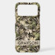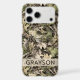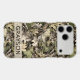 Customize this leaves camouflage iPhone 17 pro max case with your name in a trendy modern CAP font in brown on opaque cream. It's masculine and perfect for your favorite military, hunting, country or outdoorsman!