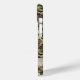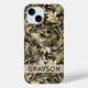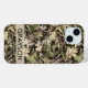 Customize this leaves camouflage iPhone 15 case with your name in a trendy modern CAP font in brown on opaque cream. It's masculine and perfect for your favorite military, hunting, country or outdoorsman!