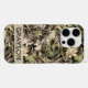 Customize this leaves camouflage iPhone 16 pro case with your name in a trendy modern CAP font in brown on opaque cream. It's masculine and perfect for your favorite military, hunting, country or outdoorsman!
