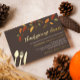 Gold foil thanksgiving dinner invitation in brown with colorful autumn leaves outlined in gold foil with a spoon, a fork, and knife in gold foil.
