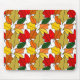 This mouse pad has a design of leaves repeating to make a pile of leaves in shades of yellow, red, orange, and green.