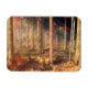 Rays of warm autumn sunlight glance through the yellow and red trees at the edge of the woods and brighten the fallen leaves on the forest floor. Deeper in the forest where the shadows are darker there are still glimpses of golden and crimson.