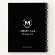 Modern left-handed notebook features a minimal design in a classic black and white color palette. Custom name presented in the center in stylish simple font with a complimentary minimal monogram medallion. Shown with a custom name and monogram initial on the front in modern typography, this personalized business notebook is designed with custom text you can customize by changing the text using the fields provided. The spiral is on the right for left-handed convenience.