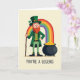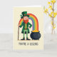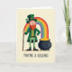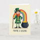 This card features a classic leprechaun centered on a soft cream background, drawn with strong outlines and smooth, flat color. He wears an emerald green top hat with a small shamrock and a matching suit, and his patterned trousers add a bit of extra detail without distracting from his friendly pose. A fiery red beard frames his wide smile, and his bright eyes feel like they’re sharing an inside joke with someone close by. In his left hand he holds a simple wooden staff, angled slightly as if he’s paused mid-stroll to greet a friend 💚. Over his right shoulder, a rainbow ☘️ curves down toward a dark pot packed with shiny gold coins. Near the bottom, the phrase “YOU’RE A LEGEND” is set in dark lettering, centered beneath the illustration. The rainbow’s bands sweep in a neat arc above the pot, with the gold coins clustered in small rounded shapes at the rim.