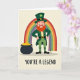 This card shows a cheerful leprechaun standing in the center with his hands on his hips, dressed in an emerald green suit and tall top hat marked with a shamrock ☘️. His rosy cheeks, bright red beard, and wide grin feel like a friendly wink to someone you care about, as if he’s posing just for them. The jacket has shiny golden buttons and trim, and his trousers carry a faint pattern that adds texture without crowding the scene. Behind him, a rainbow 🌈 arcs across the background in clear color bands, framing him like a spotlight. Near the rainbow’s end sits a rounded dark pot overflowing with gold coins, and a slim walking stick rests off to the side as a small extra detail. Along the bottom, the message “YOU’RE A LEGEND” is set in black, all caps, centered beneath the illustration. The background stays a soft creamy tone, making the greens, golds, and rainbow colors stand out, with the pot of gold tucked near the lower edge under the rainbow’s curve.