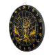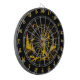 1. Introducing an exquisite dart board that transcends the ordinary, designed to elevate any man cave or tourist attraction sales outlet into a realm of sophistication and whimsy. This stunning piece features a striking gold and black design that captures the eye and ignites the imagination. At the heart of this unique dart board lies a captivating depiction of the legendary yeti, also known as Bigfoot or Sasquatch, rendered in luxurious gold. The yeti is playfully engaged in a game of golf, set against a picturesque backdrop of majestic pine trees that frame the scene, creating an enchanting forest mountain area. The rich black surface of the dart board serves as a perfect contrast, allowing the golden hues to shimmer and shine, making it not just a game accessory but a statement piece of art.