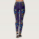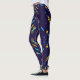 Leggings feature a dark purple background with vibrant geometric patterns in yellow, orange, and blue. Paired with black-and-white sneakers. Modern and dynamic.