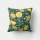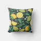 Pillow with a cute pattern featuring yellow lemons and green lime fruit with stalks of leaves set on a dark green background.