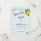 Announce your special day with Mediterranean charm! This Italian-inspired Save the Date features a soft light blue background framed by a whimsical cobalt blue border with playful swirls along the top, left, and right. A vibrant lemon branch adds a cheerful, romantic touch—evoking the sunshine and style of the Amalfi Coast.