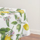 Lemon branches with blossoms and fruit on white tablecloth