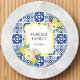 Brighten up any occasion with this classic round sticker! Featuring a yellow lemon citrus design, navy blue Mediterranean tile pattern, and floral botanical charm.