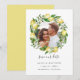 Elegant botanical save the dates feature a favorite engagement photo encircled by a round wreath of lemons citrus and leaves in an elegant watercolor palette of yellow, green and white.