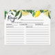 This is a post card size lemons and floral bridal shower recipe card and is a sweet way to have your guests write out their favorite recipe for you. The back of the card features the same lemon and floral arrangement image as on the front.