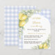 Celebrate your upcoming bundle of joy with this elegant lemon-themed baby shower invitation. Featuring a soft dusty blue and white gingham background, delicate watercolor lemons, fresh greenery and a blue bow, this design creates a warm and inviting atmosphere perfect for a summer or citrus-inspired baby shower.