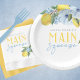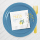 Elegant and Sweet Lemon Main Squeeze Personalized Coined Cocktail Paper Napkins. Customize with the bride-to-be's name. Featuring beautiful elegant dusty slate blue watercolor flowers and a sweet yellow lemon.