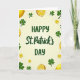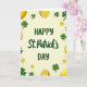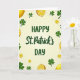 This card features the large text “HAPPY St. Patrick’s DAY” centered on a soft, sunlit cream background, with “HAPPY” and “DAY” in rich green and “St. Patrick’s” in a flowing green style between them. A gentle wash of light across the page gives the scene a cozy, friendly glow that feels like early spring. Around the message, a border of lemons and shamrocks frames the design, like a little wreath you’d spot on a café table during a holiday date. The lemons appear both whole and sliced open, showing pale yellow flesh and tidy segments that add a fresh, inviting touch. Shamrocks mix in between the citrus, some in deep emerald green 💚 and others in warm golden yellow, including both three-leaf and four-leaf clovers ☘️. The way the leaves and fruit lean toward each other, alternating and overlapping, creates a gentle back-and-forth rhythm that hints at closeness and easy conversation. Green lettering sits prominently in the middle while the lemon-and-clover border runs evenly along all four edges, with slices tucked into the corners and small shamrocks filling the gaps.