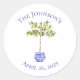 A round sticker with a lemon topiary and blue font features a charming, vibrant design that is both elegant and fresh. The sticker showcases a beautifully illustrated lemon topiary, with yellow lemons nestled amidst lush green foliage, arranged in a classic, symmetrical topiary shape. This adds a cheerful, Mediterranean-inspired touch to the design. The text, such as a name, date, or short phrase, is elegantly printed in a flowing blue font, which contrasts beautifully with the bright lemons and green leaves.
