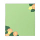 Fresh juicy pattern featuring illustrated lemons and oranges with green leaves scattered on green background.