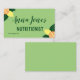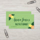 Simple elegant, modern businnes card featuring illustrated lemons and oranges with green leaves scattered on geen background.