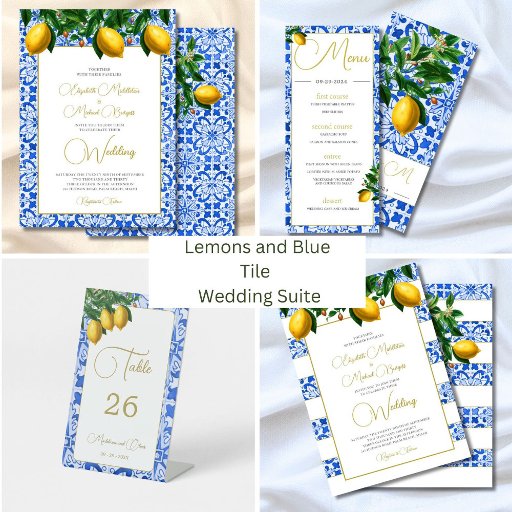 A timeless Summery Lemon and italian inspired blue tile elevates this simple design to herald your elegant wedding.
