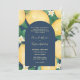 Elegant wedding invitations feature watercolor painting of lemons and greenery accented with white citrus blossoms on navy blue with your wedding text in pale yellow on a navy blue arch inset and the details for your wedding on the back. MATCHING items available in our store.