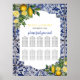 Hand painted traditional tiles from Portugal design with Mediterranean lemons. Azulejo blue and white floral leaf tile artwork. A beautiful Mediterranean design depicting yellow lemons with their greenery and blossoms against a blue and white vintage Portuguese pattern. The wedding text is elegantly framed with a white geometric shape. Unique Azulejo blue and white floral wedding seating chart design with modern elements. Matching wedding invitations and other stationery items are also available.