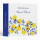 This fresh and bright design can adapt to a tropical, mediterranean, or tuscan theme. It features an illustration with lemons, leaves and branches in colorful yellow and royal blue. The color palette can wait with main stream home and party decor. This item can be personalized for a summer house, a vacation house, or a rental house, adding a unique touch to the decor. Add a family name, or a location for an added unique look.