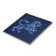 Tile in the zodiac symbol for Leo in soft silver blue, overlaid with the stars of the constellation, against a starry sky background in deep midnight blue