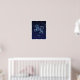 Poster featuring the symbol for Leo in soft silver blue, overlaid with the stars of the constellation, against a starry sky background graded from deep midnight blue to black.