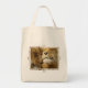 The printing came out very well, better than I had anticipated. The natural color fabric is sturdy with strong seams and comfortable handles. This tote fits easily over my shoulder. As it is filled, the bottom flattens out--very cool! I would buy this product again. This grocery tote holds a lot of groceries! The image quality was very good. The colors were a little darker than I had expected. The darkness may have been due to printing on a natural color fabric rather than on white. The cat design is attractively centered on the tote. The spirit of the design is very lively, just as it appears on the Zazzle website.