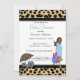This design features an adorable African-American Mommy-to-be wearing a light blue dress with leopard print accents and leopard print shoes. She is carrying colorful shopping bag and sporting a cute baby bump. There is a pile of coordinated gifts, along with a leopard print umbrella waiting for her in the corner. We have plenty of customizable text for you to add your party information. Leopard print framing along the top and bottom of this trendy baby shower invitation completes the look of this great girly pattern. The reverse side of this invitation has the same leopard pattern. We have matching stamps available too! If you need this design on other products please use the send message feature attached to this store and we will be happy to create that product for you.