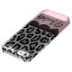 An exotic faux fur sliver and black leopard print adorned with lacy black ornate half circles on a metallic pink blush border for extra glam. Fancy chic vibes.